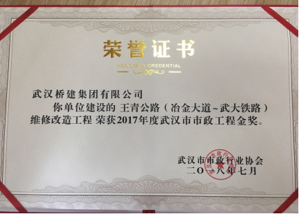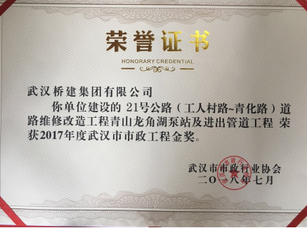8月7日,從武漢市市政行業(yè)協(xié)會傳來喜訊,由橋建集團代建的21號公路(工人村路~青化路)道路維修改造工程青山龍角湖泵站及進出管道工程、王青公路(冶金大道~武大鐵路)維修改造工程、解放大道下延線道路5標橋梁部分(二)施工工程三個市政項目,獲得2017年度武漢市市政工程金獎。
