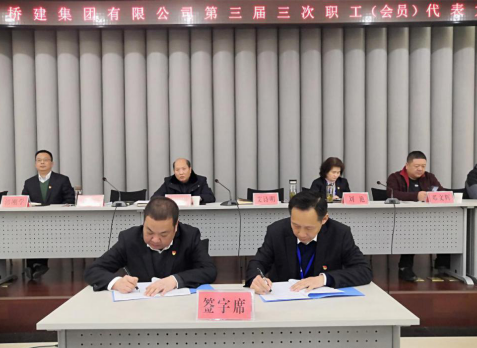 2月25日上午,集團公司第三屆職工(會員)代表大會三次會議在公司1503會議室召開。大會應到代表42人,實到代表37人,符合法定開會人數。公司黨委書記、董事長朱明剛出席大會并作重要講話,總經理、黨委副書記艾詩明代表公司簽訂有關協議。