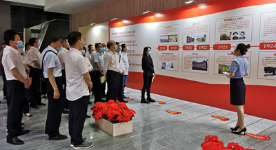 在武鋼博物館一樓大廳,全體黨員面對鮮紅的黨旗,在莊嚴的氣氛中重溫入黨誓詞。隨后在講解員的帶領下,全體人員參觀了設在一樓的中國共產黨黨簡史展板,回顧了從1921年到2021年一百年間中國共產黨在“開天辟地”“改天換地”“翻天覆地”“驚天動地”四個階段中的104個大事記,學習了中國共產黨從誕生、發展、壯大到建立新中國,以及帶領全國人民建設小康社會波瀾壯闊而燦爛輝煌的革命歷程。