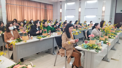 女職工們興趣盎然,邊看邊學,享受著親自創作的樂趣和插花藝術帶來的快樂。一支支康乃馨、香檳玫瑰、桔梗、滿天星,經過女同胞們的巧手修剪、精心搭配,構成了一籃籃錯落有致、造型各異的作品,寄托著大家對美的理解和對幸福的感悟。現場花香四溢,充滿著春天的氣息。