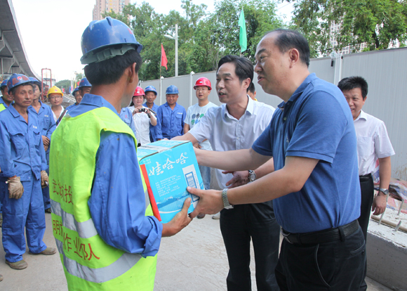在京漢大道武勝路立交工程現(xiàn)場,胡市長與施工人員一一握手,將防暑降溫品送發(fā)到工人手中,反復囑咐工人們一定要注意防暑降溫,注意抓好安全生產(chǎn),將安全意識切記于心,并對建設(shè)者們不畏高溫、堅守崗位表示感謝和慰問。在認真聽取了工程的進展情況匯報后,胡市長要求施工單位在保證質(zhì)量的同時加快施工進度。隨后,胡市長一行分別來到東湖路上已啟用的兩座地下人行通道,實地查看了行人通行情況和環(huán)境衛(wèi)生情況。