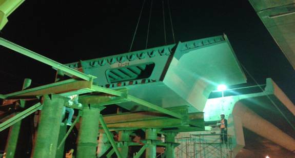 作為解放大道下延線改造工程的關鍵控制性工程漢黃路高架橋在經過近半個多月鋼箱梁吊裝準備工作后,在保證安全及交通組織完善的情況下,于2015年4月21日晚開始鋼箱梁吊裝。